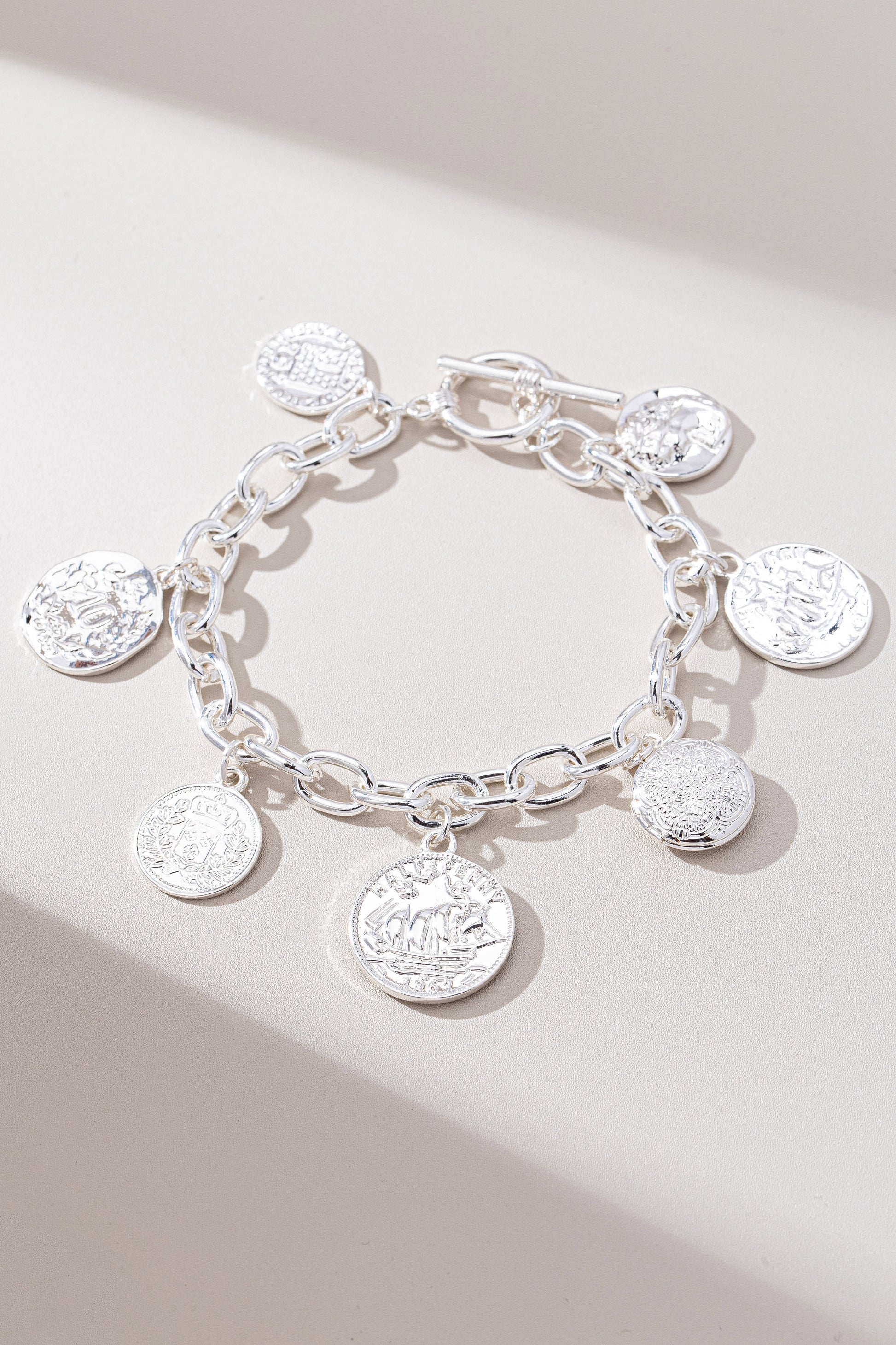 Add a vintage touch to your wrist with this elegant gold-tone charm bracelet, featuring an assortment of textured coin pendants that evoke old-world charm. The sturdy link chain is secured with a toggle clasp, making it easy to wear and remove. Perfect for stacking or wearing solo, this bracelet adds a sophisticated and timeless flair to any outfit.