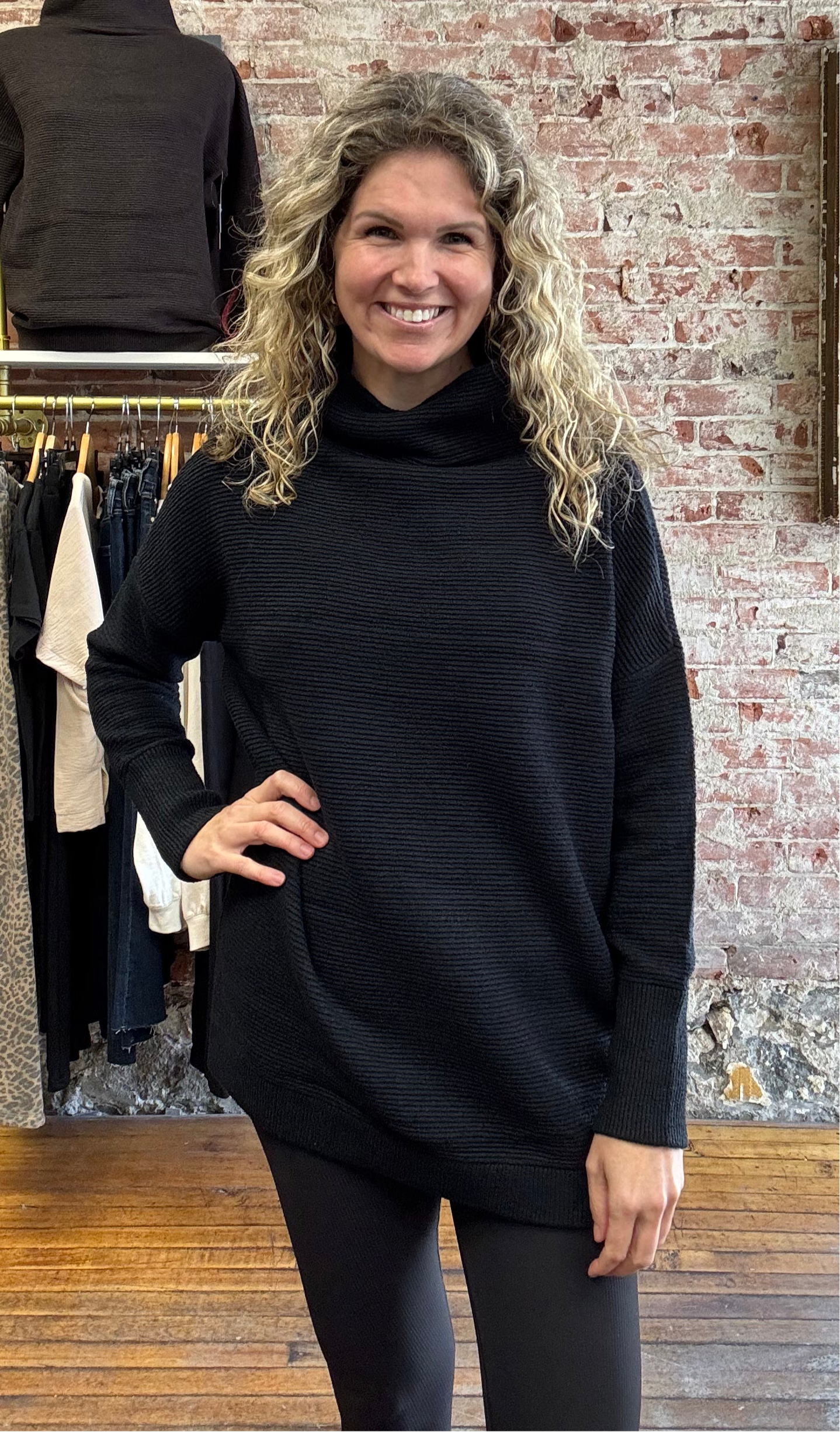 A long cozy sweater that wraps you in warmth featuring a relaxed, cozy fabric and a draped silhouette that falls below the hips-perfect for layering on chilly days. Colour-Black